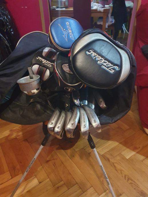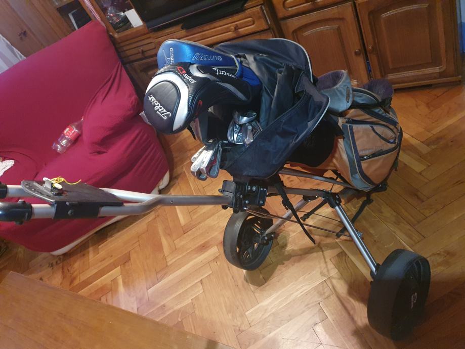 Torba original Wilsonstaff sa kolicima i svim originalnim štapovima:S,P,9,8,7,6,5,4 i weđ 56 i 60. Pecalica za loptice iz vode i pobiralica loptica.