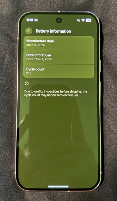 Mobitel je u odličnom stanju i bez tragova korištenja, stalno nošen u maskici. Postotak baterije je 100%, a battery cycle count je 248.
