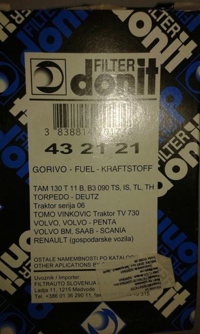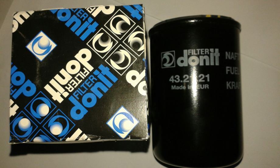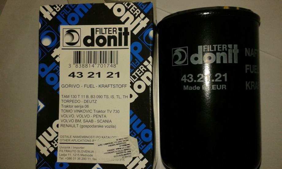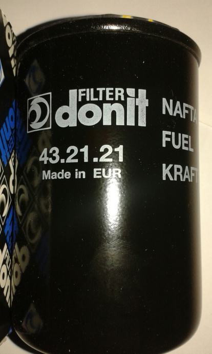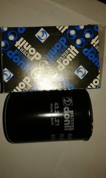 Filter goriva Donit 43 21 21, odgovara za Tam, Torpedo, Tomo Vinković, Volvo-Penta, Saab-Scania, Renault, ...., visina filtera: 120mm, vanjski promjer: 76mm, unutarnji promjer brtve: 62mm, vanjski promjer brtve: 71mm, navoj: M16.
