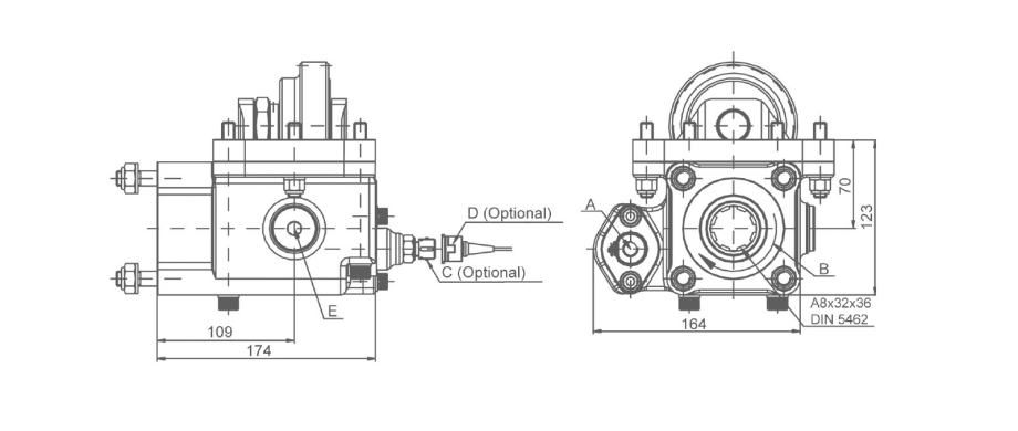 PTO, izvod snage iz mjenjača, za spajanje pumpi s vijcima ISO 4. Pneumatsko ukapčanje, postavljanje desnu stranu mjenjača.