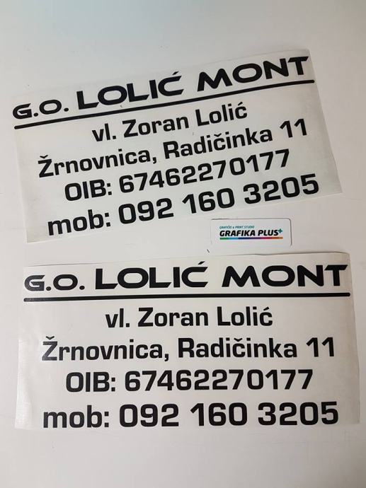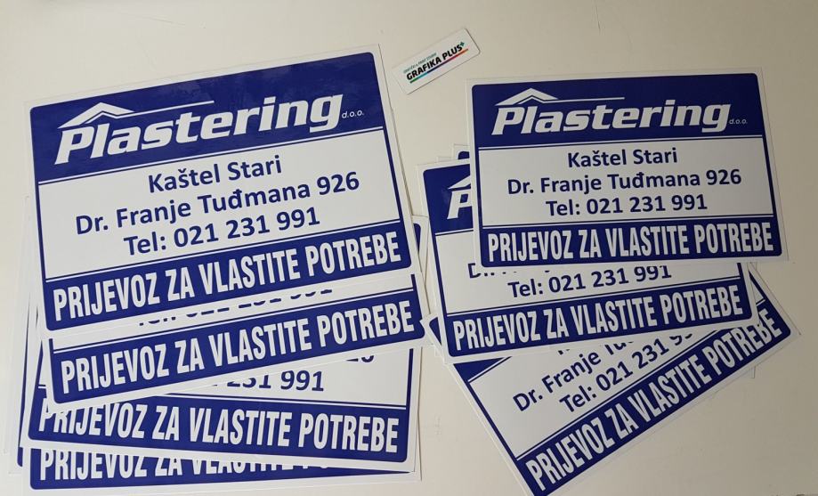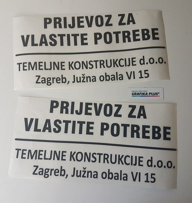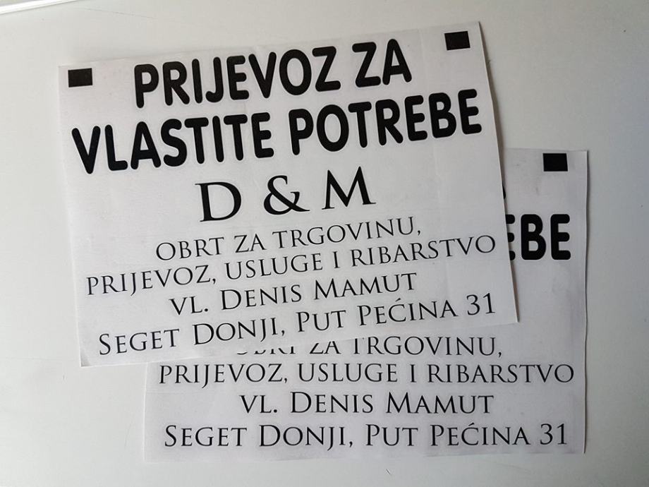 Izrađujemo zakonom obvezan natpis “PRIJEVOZ ZA VLASTITE POTREBE” s ostalim podacima kojeg moraju imati svi vlasnici teretnih vozila (dostavno, kombi, kamion…) da bi zadovoljili uvjete na tehničkom pregledu, te izbjegli eventualnu kaznu prilikom pregleda Prometne policije.