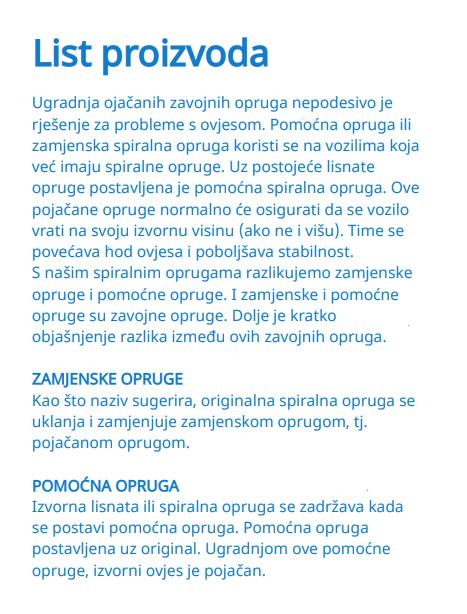 Ugradnja ojačanih zavojnih opruga nepodesivo je rješenje za probleme s ovjesom. Pomoćna opruga ili zamjenska spiralna opruga koristi se na vozilima koja već imaju spiralne opruge. Uz postojeće lisnate opruge postavljena je pomoćna spiralna opruga. Ove pojačane opruge normalno će osigurati da se vozilo vrati na svoju izvornu visinu (ako ne i višu). Time se povećava hod ovjesa i poboljšava stabilnost.