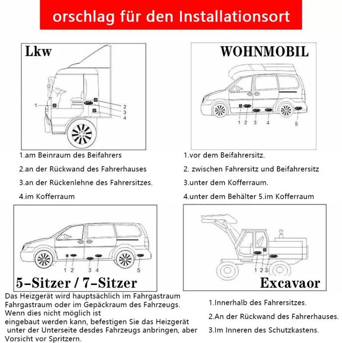 Zračni dizel grijač može se koristiti za kamione, čamce, prikolice za automobile, kamp prikolice, kampere, karavane, monovolumene i sve vrste drugih dizel vozila. Dizelski grijač zraka također je prikladan za unutarnju upotrebu, kao što je dom, skladište, tvornica, ured itd. Savjeti: Što je manja soba, to je brža toplina. Ako je prostorija velika, preporuča se kupiti još nekoliko grijalica za zagrijavanje. Daljinskim upravljačem se može podešavati predgrijanje, količina ulja, temperatura i brzina puhanja, a može se eliminirati inje na staklima. Ekološki prihvatljiv zračni dizel grijač, niske emisije, niska potrošnja goriva.