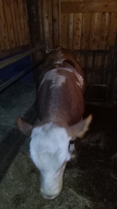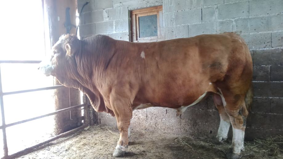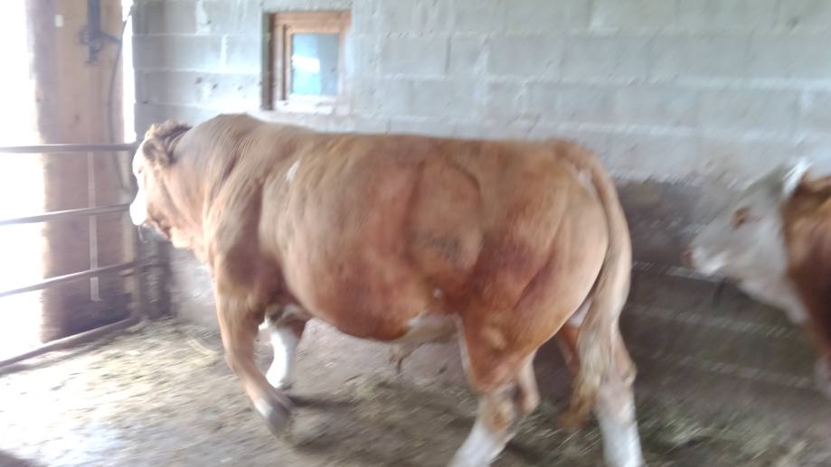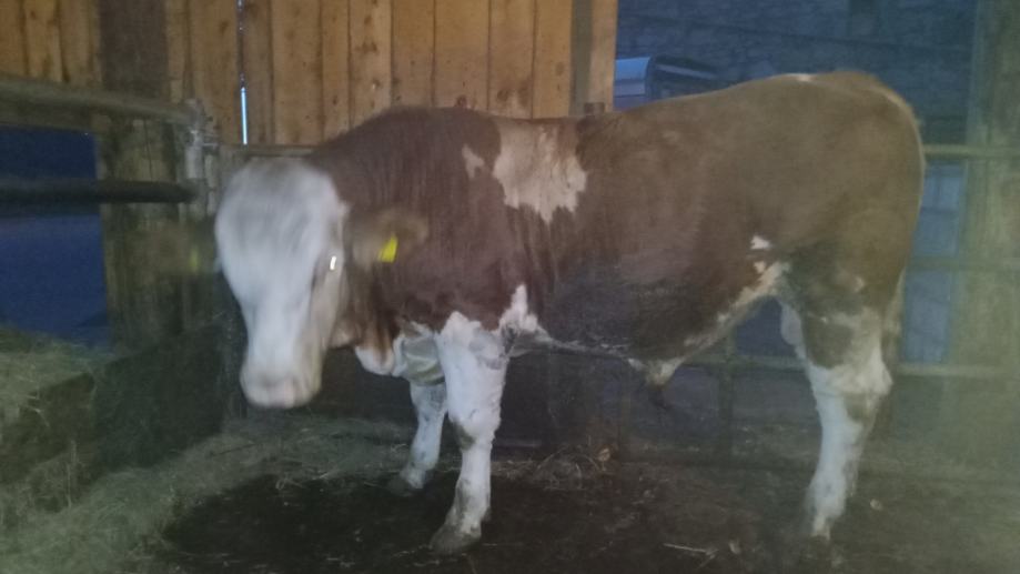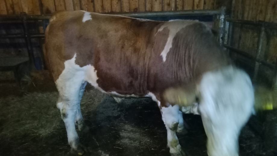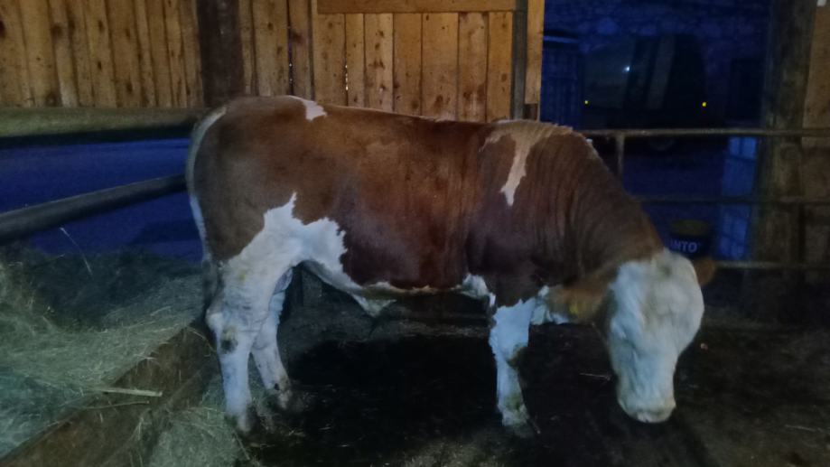 Mladi bik simentalske pasmine za rasplod (mesni tip) 16 mjeseci starosti, bezrožan, težina oko 600 kg. Na zadnje dvije slike se nalazi otac od bika