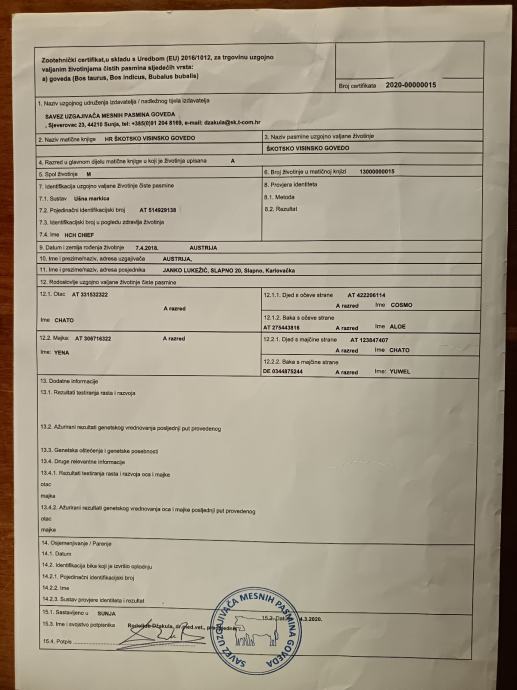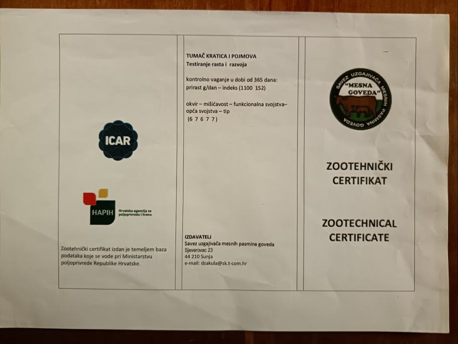 Odličan pedigrirani bik, podrijetlom iz Austrije. Izrazito miran, nikad nije pokazao nikakvu agresiju, ni prema ljudima, ni prema drugim životinjama. Star sedam godina, što je još prilično mlado za ovu dugovječnu pasminu. Odaziva se na ime Chief.
