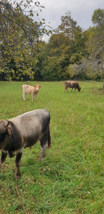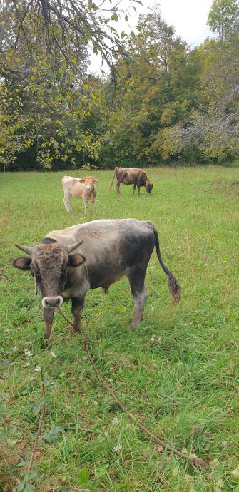 2 junice starosti 2, 5 godine, stelne, jedna s teletom A druga u se u 8 mj teli, bik star 1.5 godinu. Naučeni na vez i el. Pastir. 3500 cijena za komplet, nije fiksno. Nisu u eku.
