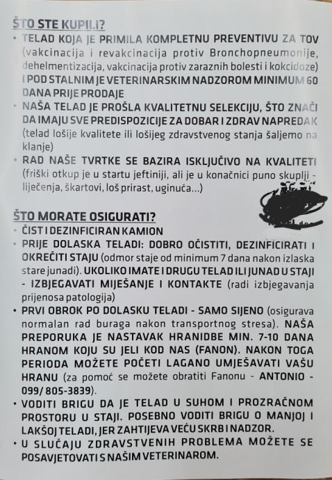 Prodajem telad za tov Simentalci i Belgijsko plavi (muški i ženski), kilaže od 140-220 kg. Cijena ovisi o kategoriji, spolu i pasmini i korigira se svakih 10 kg. Uvijek u ponudi imamo 200-300 komada teladi na farmi. Sva telad je primila kompletnu preventivu (vakcinacija, revakcinacija, čišćenje od nametnika) i prošla je strogu veterinarsku provjeru.
