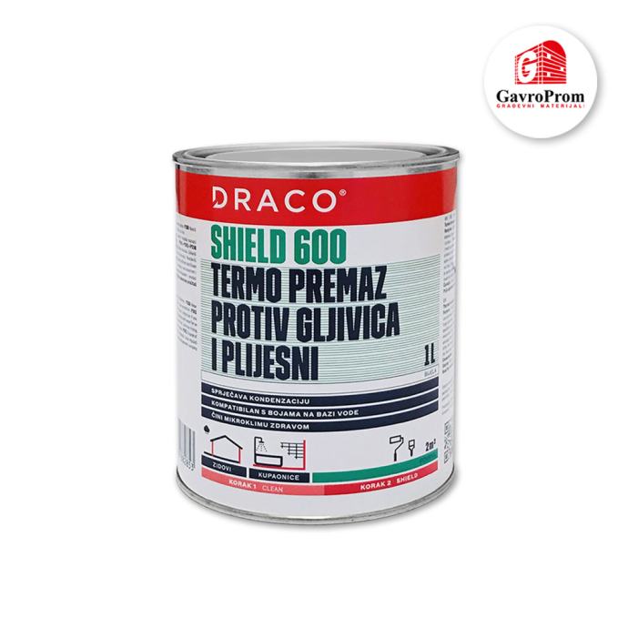 DRACO SHIELD 600 je zaštitni anti-kondenzacijski premaz za hladne površine (armirano betonski zidovi i stupovi, neizolirani zidovi itd.) za sprječavanje nastanka gljivica i plijesni. Zahvaljujući svojim karakteristikama održava površinu toplijom pa time eliminira hladne mostove. Razlika u temperaturi površine tretirane DRACO SHIELD 600 je +5°C u odnosu na uobičajene boje. Povećanje temperature sprečava kondenzaciju zraka na zidovima do relativne vlažnost zraka u prostoriji od 90%. Sprečavanjem stvaranja kondenzata eliminirana je pojava plijesni.