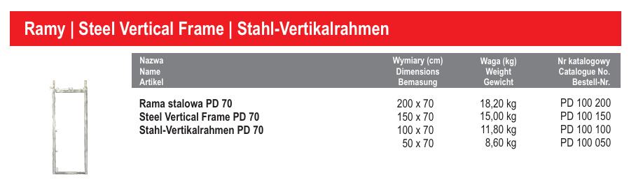 Izrađeni od zatvorenih profila. Zvjezdasti klinovi osiguravaju jednostavnu i sigurnu montažu podesta. Samosigurnosni zakretni klinovi za pričvršćivanje dijagonala i rukohvata uklanjaju potrebu za korištenjem montažnih alata, čime se značajno skraćuje vrijeme montaže. Okviri PD 70 pripadaju maksimalno 3. klasi opterećenja, kako u verziji od vruće cinčanog čelika, tako i u aluminijskoj izvedbi.