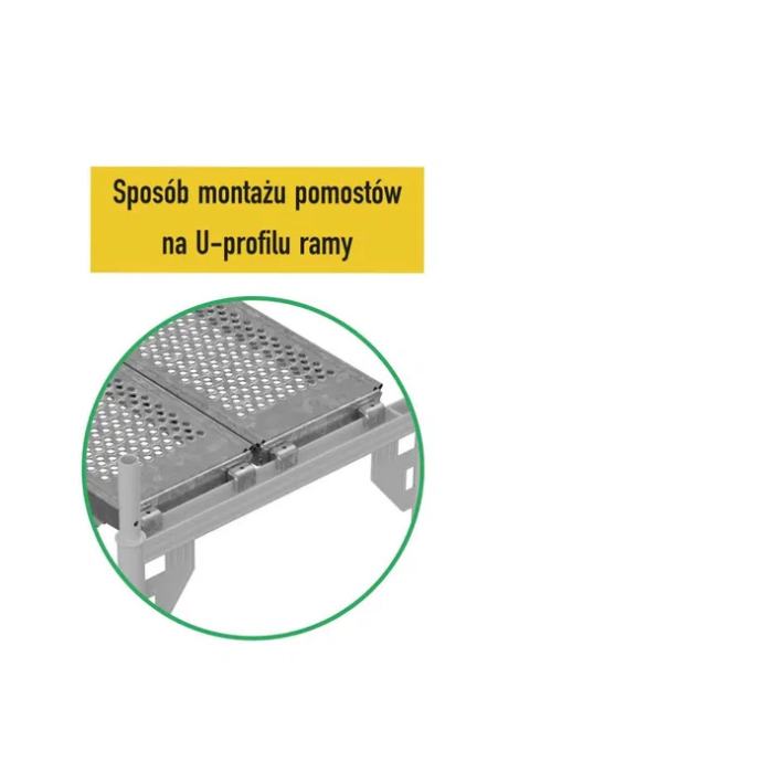 Ova čelična platforma predstavlja čvrsto i pouzdano rješenje za sustave skela, pružajući sigurnost i udobnost pri radu na visini. Proizvod je izrađen od visokokvalitetnog čelika, vruće pocinčanog, što jamči dugotrajnost i otpornost na koroziju.