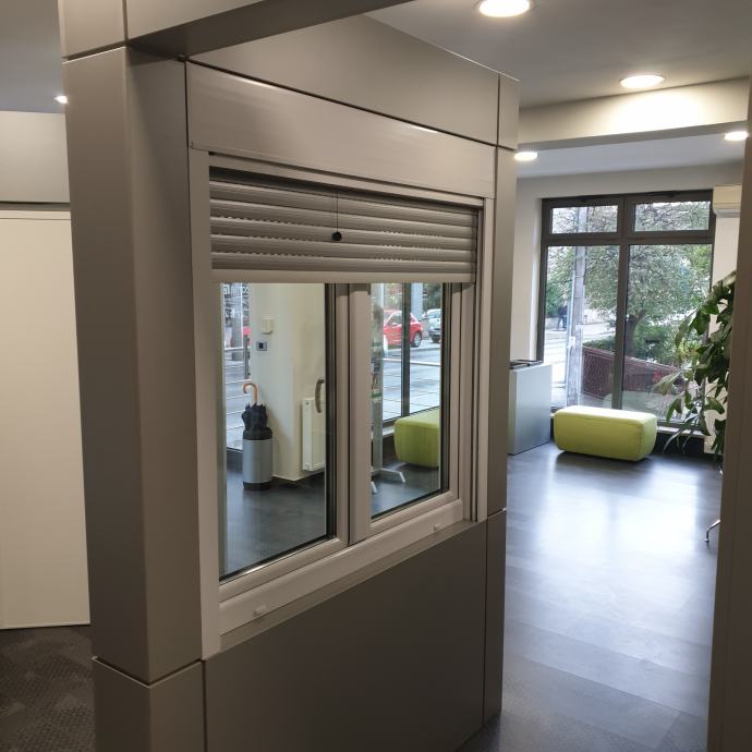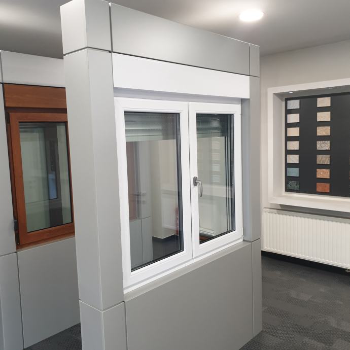 PVC bijeli dvokrilni otklopno zaokretni prozor 140 x 140 sa aluminijskim lamelama, elektromotoronim pogonom, rolo mrežicom protiv insekata, izložbeni exponat
