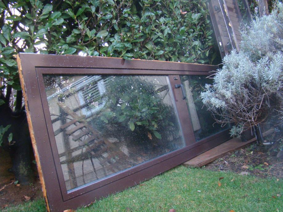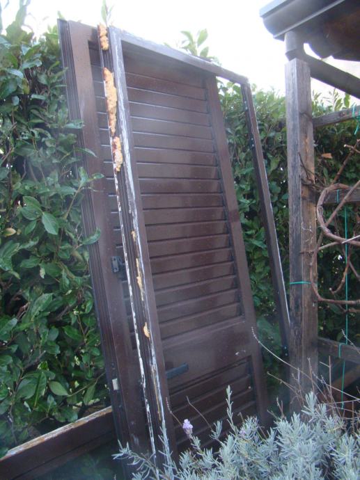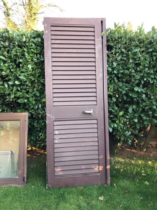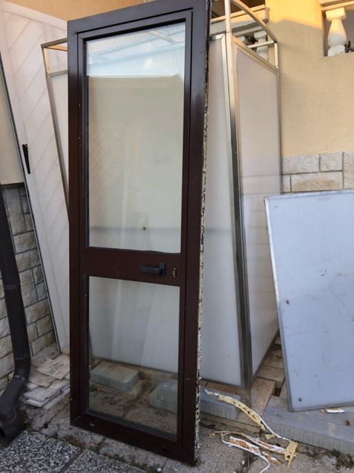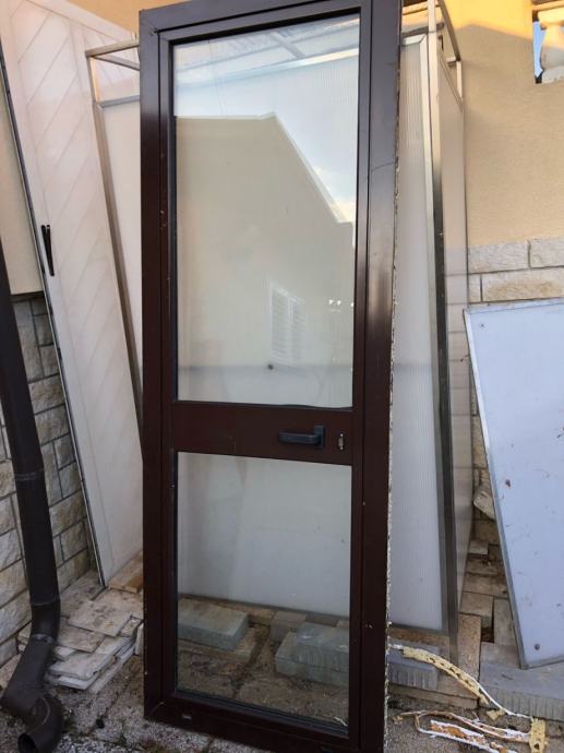 Aluminijska stolarija komplet, Staklena Vrata sa duplim staklom i bravom + okvir, Grilje sa bravom + okvir, Plastificirano u smeđu boju. Dimenzije Stakleni dio( Š x V x D ) u cm x x, Grilje ( Š x V x D ) u cm x x; Art. No. P2024
