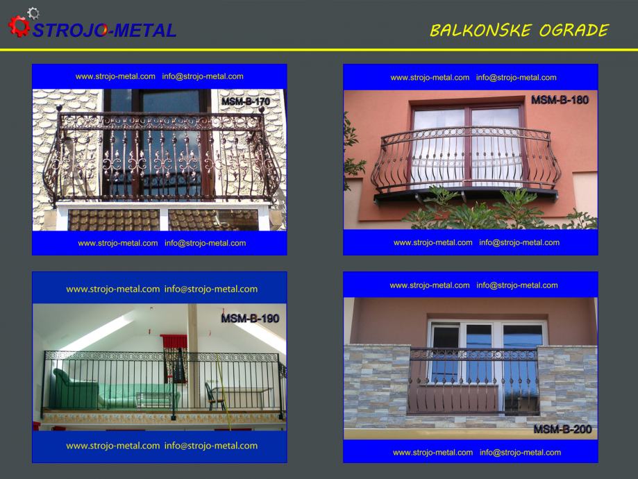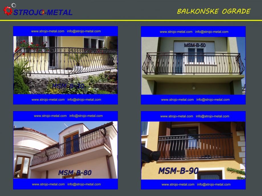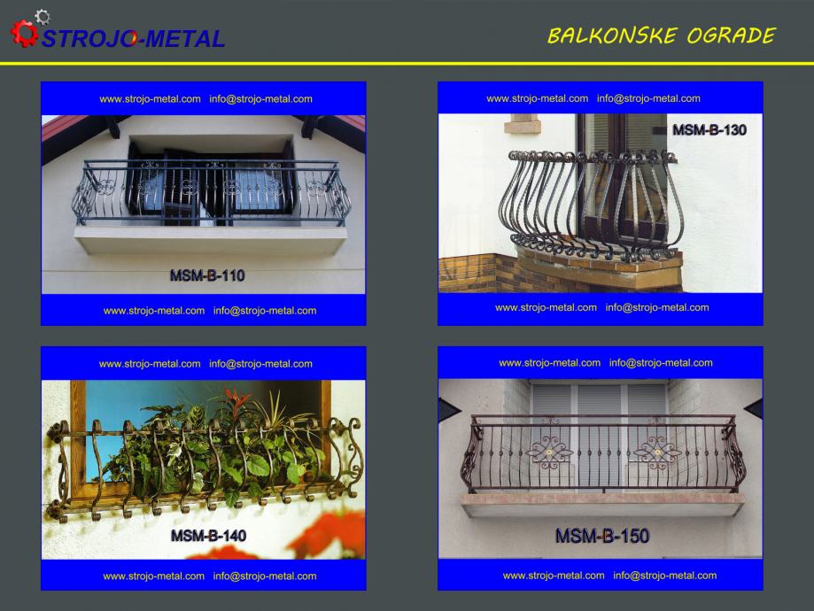 balkonske ograde svih dimenzija i oblika. Nekoliko modela možete vidjeti u našoj NJUŠKALO trgovini a ostale na www.strojo-metal.com. Prilikom upita molim navesti oznaku ( npr. MSM-B-210 ), mjesto montaže i dužinu željene balkonske ograde.