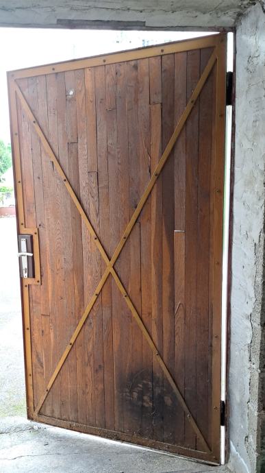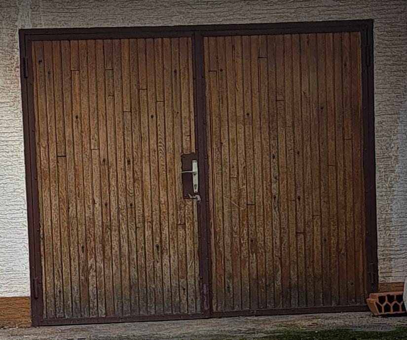 Prodajem dvokrilna garažna vrata s metalnom konstrukcijom i okvirom, ispunjena drvenom lamperijom.
