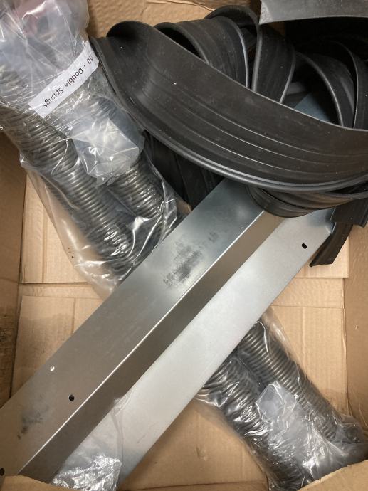 Prodajem nova izrezana četiri obostrana bijela METECNO RAL9010 panela (63cm +3x52cm) s više crta iznutra, a upola manje crta izvana (243x212,5 cm) sa dvije bijele blende (U profilom od 2 kom. x 3m) za početak/završetak panela sa svim okovima, vodilicama, kotačićima, šarkama, bravicom i obostranom plastičnom ručkicom… (vertikalna i horizontalna vodilica) za kompletna sekcijska garažna vrata (niski nadvoj) u što su uključene dvije spring opruge 250x250 (5x51x610mm) sa željeznom osovinskom cijevi od 3m i dva kolotura za obje strane sa niskim nadvojem za postojeći otvor betonskog prolaza (š/v) 240x210 cm.