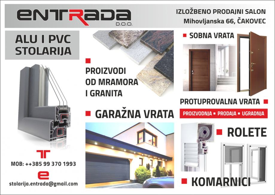 Svoje poslovanje temeljimo na vlastitoj proizvodnji roleta i komarnika,te prodaji i ugradnji garažnih vrata,drvenih unutarnjih vrata,protuprovalnih ulaznih vrata,PVC prozora,te ALU,PVC,mramornih i granitnih prozorskih klupćica.