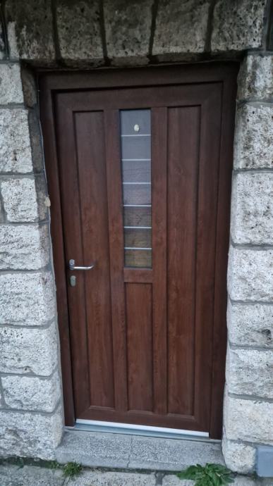 Ulazna vrata opremljena kvakom obostrano, Security automatic bravom, Dr. Hann pantima i aluminjskom pragom.