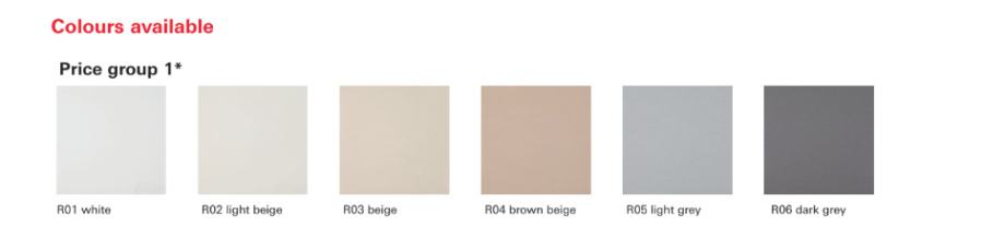 Na raspolaganju je velik izbor boja tkanina i dvije vrste materijala - jednobojni dekor koji propušta svjetlo (cjenovna grupa C) i jednobojni dekor koji propušta svjetlo s premazom bisernog sjaja za zaštitu od topline (cjenovna grupa B).