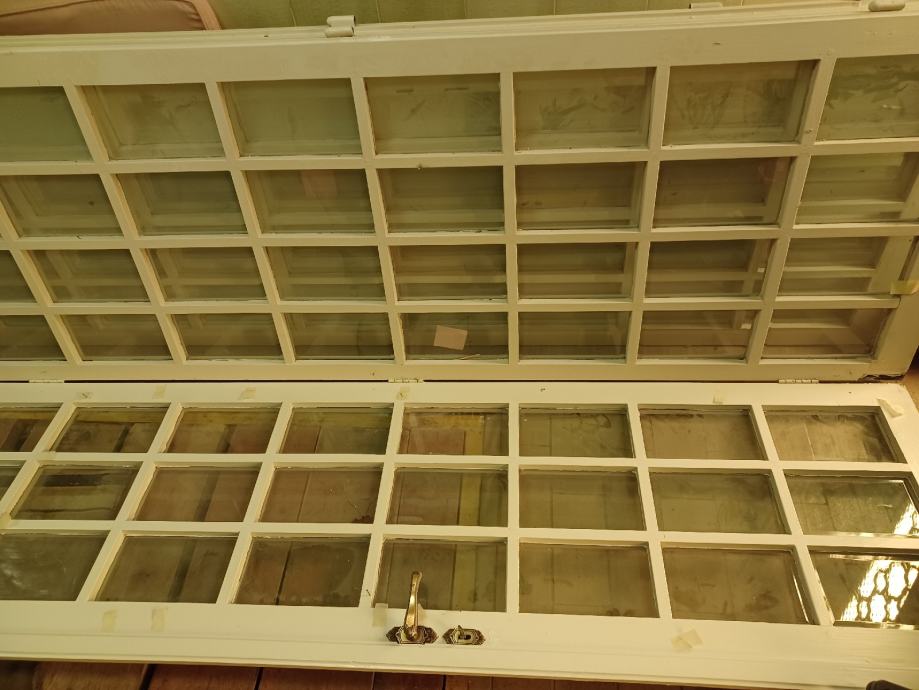 -dupla vrata sa brušenim staklom i kvakama. Dva komada u setu koji se mogu još spojiti.Uži dio 70 x 239 cm, širi dio 80x239 cm. Imamo 2 kompleta.