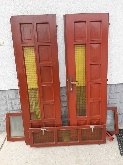 Prodajem drvena ulazna vrata sa dva krila ukupne širine 120 cm, visine 190 cm i nadsvjetlo visine 30 cm, bez okvira (štok) i dva manja prozora bez štoka