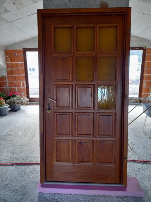 Hrastova, lakirana vanjska vrata. Ocuvana i skladistena. Visina 2m,širina metar,debljina štoka 5 cm,otvaraju se na lijevo.cjena po dogovoru.