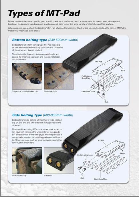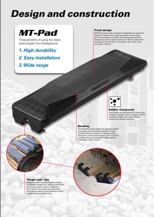 MT-Pad je pojedinačna vulkanizirana gumena navlaka s unutarnjim čeličnim pločama. Jednostavno se postavljaju na podvozje bagera ili građevinskih strojeva namještajući ih preko vrha postojećih čeličnih papuča. MT-Pad je dobro rješenje za velike bagere na gusjenicama od čelika koji oštećuju površinu zemlje i kada gumene gusjenice nisu dostupne za veće strojeve.