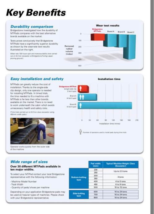 Bridgestone MT-Pad gumenu navlaku isporučuje širom svijeta. Od 1970-ih dizajnirali su, razvijali i dobavljali široku paletu gumenih rješenja za strojnu industriju.
