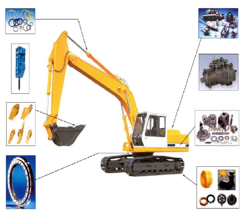 - Dijelovi hidraulike (glavna pumpa hidraulike, hidromotori okretanja, servo motori, distributori, pogonski reduktori ...)