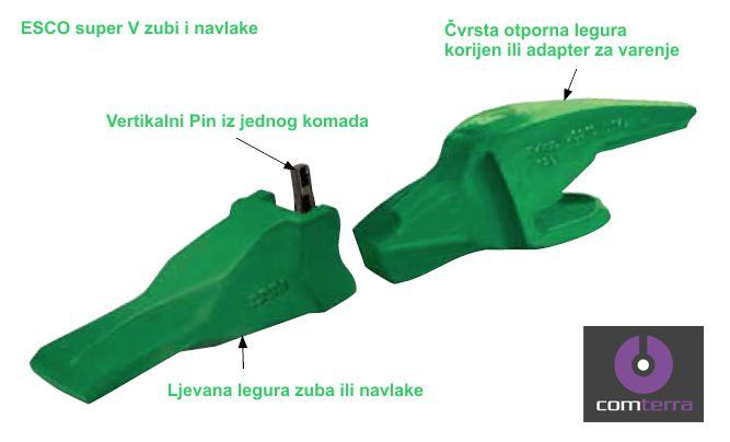 Originalni ESCO zubi za korpu bagera Super V sistem. od veličine V13, V17, V19, V23, V29, V33, V43, V51, V59