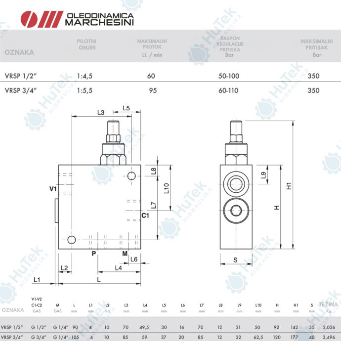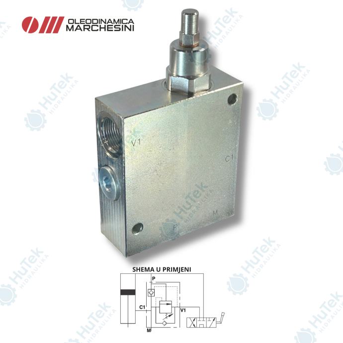 UGRADNJA: Priključak "C1" spojiti na cilindar na stranu manjeg volumena, "V1" na razvodni ventil, "P" na cilindar i razvodnik istovremeno.