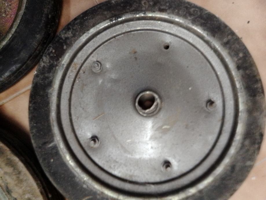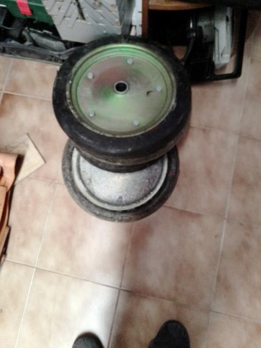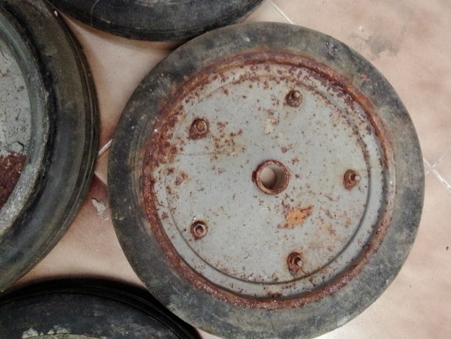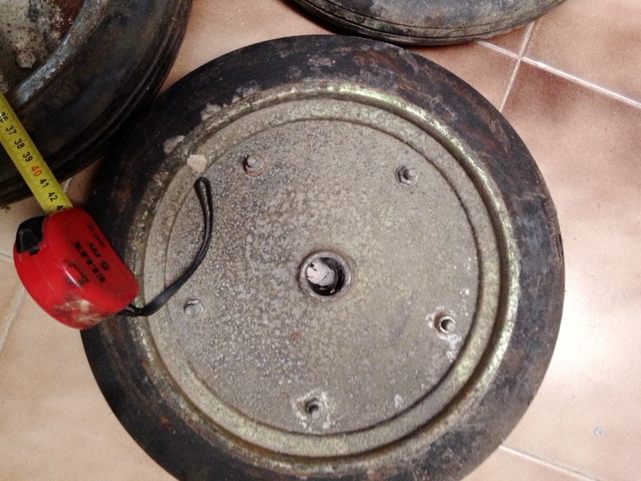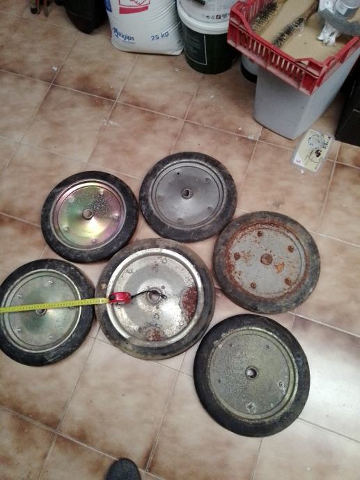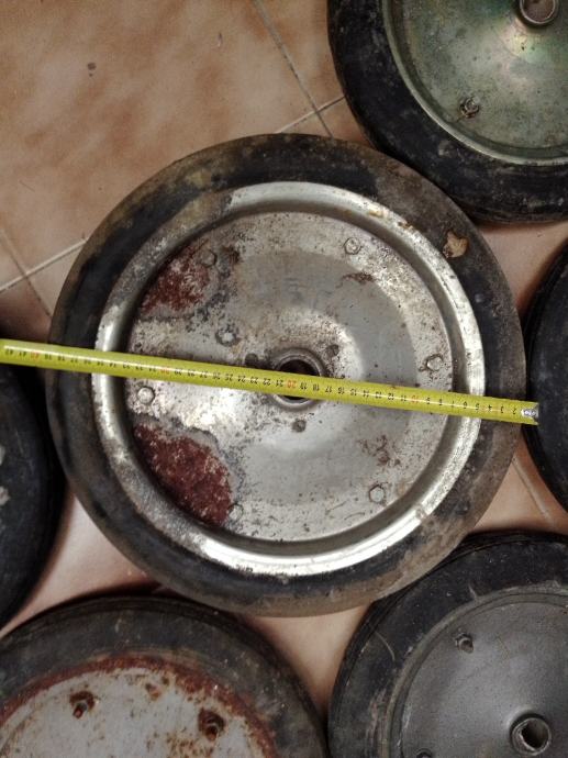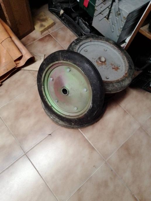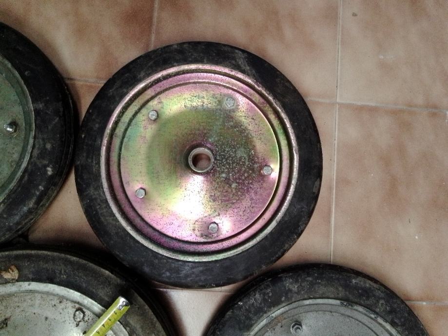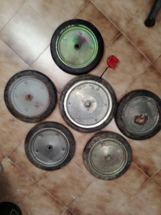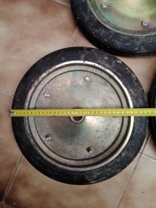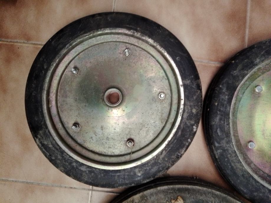5 manjih (35cm vanjski a rupa fi26.5 mm i širina gume 47 mm) i 1 veći (40cm vanjski a rupa fi33mm)točkovi sa tvrdom punom gumom za građevinske strojeve i teške terete. Cijena za komad je 30€ ,komplet 150€.Šaljem poštom uplatom na moj tekući račun+ troškovi poštarine.