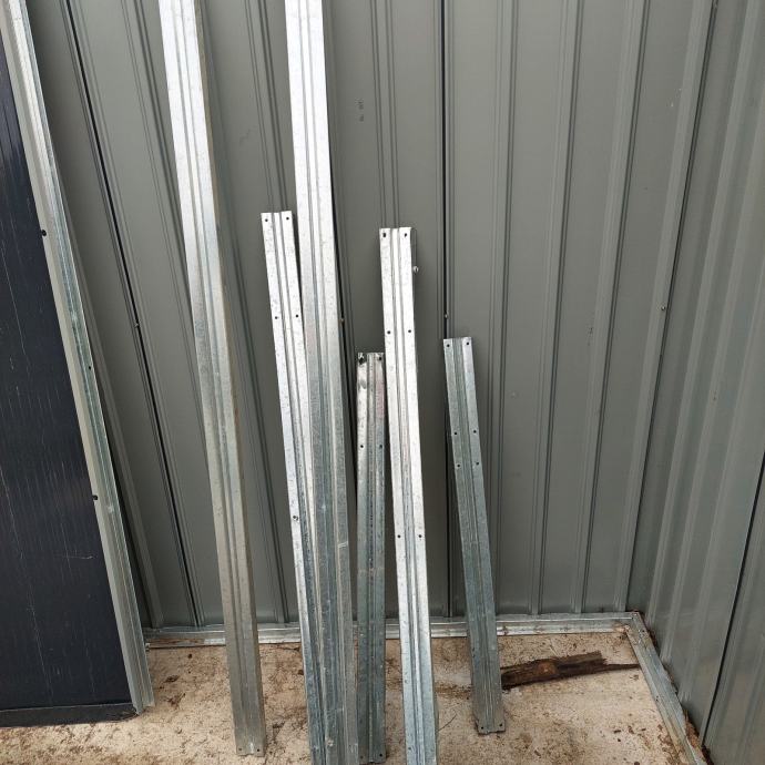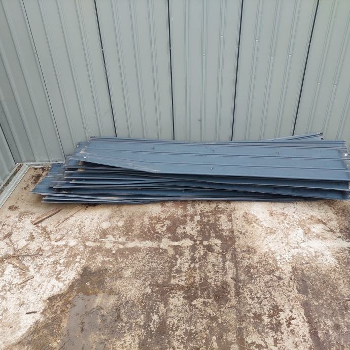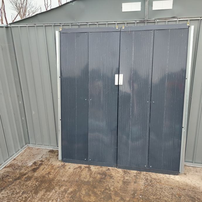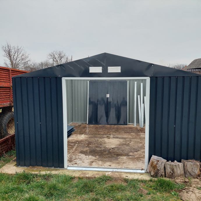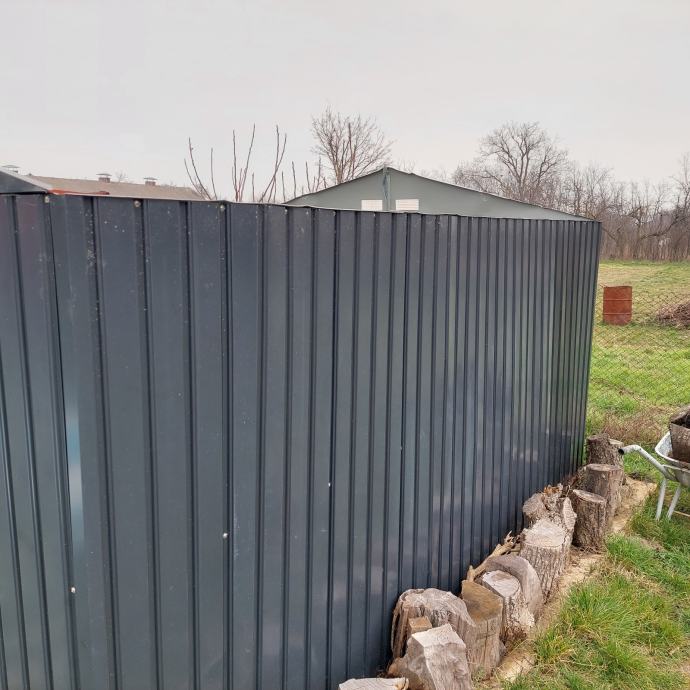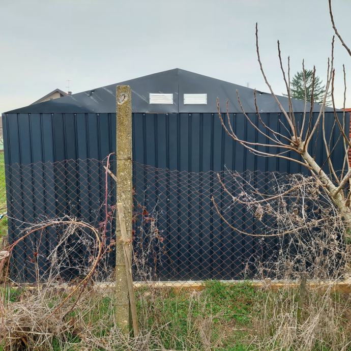 Prodajem rabljenu limenu konstrukciju, odnosno montažni metalni objekt tamnosive (antracit) boje. Radi se o čeličnoj montažnoj garaži ili spremištu s krovištem na dvije vode, ventilacijskim otvorima na prednjem dijelu krova te širokim ulaznim okvirom. Konstrukcija je izrađena od profiliranog lima, a okviri su svjetlosive boje. Objekt je slobodnostojeći i pogodan za korištenje kao garaža, skladište ili gospodarski prostor.