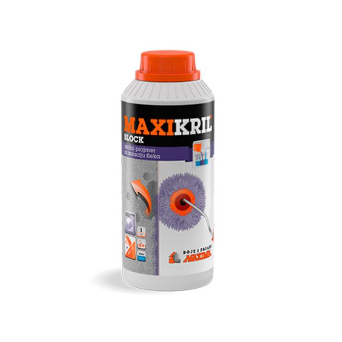 MAXIKRIL Block je akrilni premaz za blokadu, odnosno izolaciju fleka koje su rastvorljive u vodi, poput fleka od duhanskog dima, čađi, fleka izazvanih prokišnjavanjem ili poplavom.