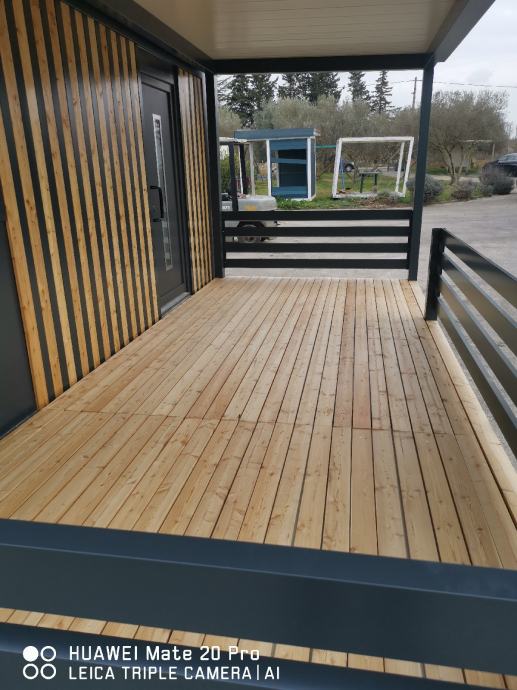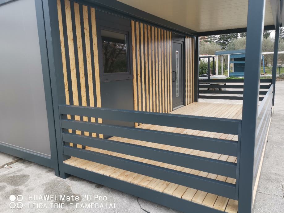 Kućice imaju metalni okvir i podiže ih dizalica. Unutarnje uređenje: zidovi knauf, sve instalacije, pod laminat, sobna vrata, futer štokovi.