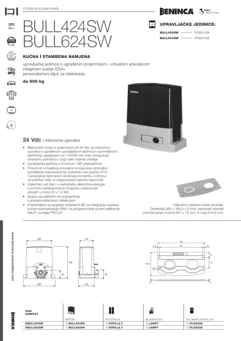 Motor s prijenosom od 24 V DC za intenzivnu uporabu s ugrađenom upravljačkom jedinicom i virtualnim enkoderom | Prekidačko napajanje od 115/230 V AC koje omogućuje smanjenu potrošnju i dugi vijek trajanja uređaja | Upravljačka jedinica s trimerom i DIP sklopkom | Prisutnost virtualnog enkodera omogućava optimalno upravljanje usporavanjima, praćenje rute (sustav STC) i upravljanje isporukom okretnog momenta u odnosu na položaj vrata uz osiguravanje najveće sigurnosti | Zajamčen rad čak i u nedostatku električne energije s pomoću baterija koje je moguće u potpunosti uklopiti u motor (2 x 1,2 Ah) | Sustav sa zaštitom od prignječenja s amperometrijskom detekcijom | Pripremljeno za spajanje dodatka X.BE za integraciju sustava kućne automatizacije KNX i za programiranje putem aplikacije BeUP i sučelja PRO.UP