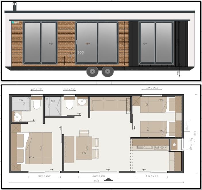 Model kućice NORD_TREND DE LUXE dim. 8,7x4,1 m (35,67 m²), kapacitet 4 +2 (sofa na razvlačenje dim. 198x80/143 cm) funkcionalna od vilice do TV-a.