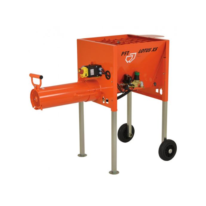 Mali, kompaktni protočni mješač PFT LOTUS XS za materijal u vrećama s priključkom izmjenične struje. Kontinuirano i automatski miješa sve suhe mortove na vapneno-cementnoj bazi do maksimalne veličine zrna 4mm. Inovativni specijalni mješač osigurava homogeno mješanje s malom snagom motora. Optimalno smješteni ulaz za vodu sprečava stvaranje naslaga te se može reći da se mješač sam čisti.