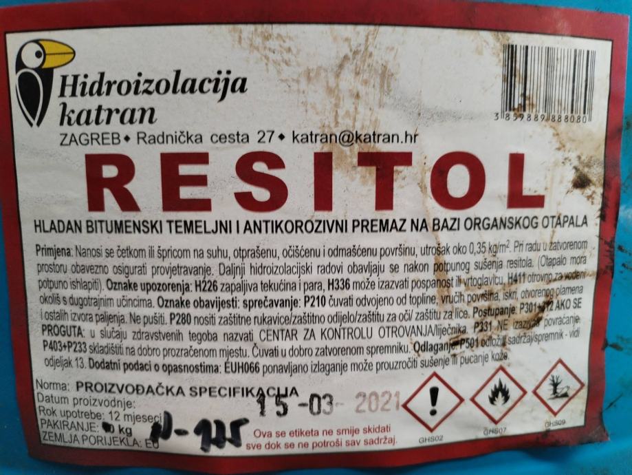 Prodaje se resitol (tekući bitumen) pakiran u kantama po 20kg. Cijena po kanti 20€(20kg).