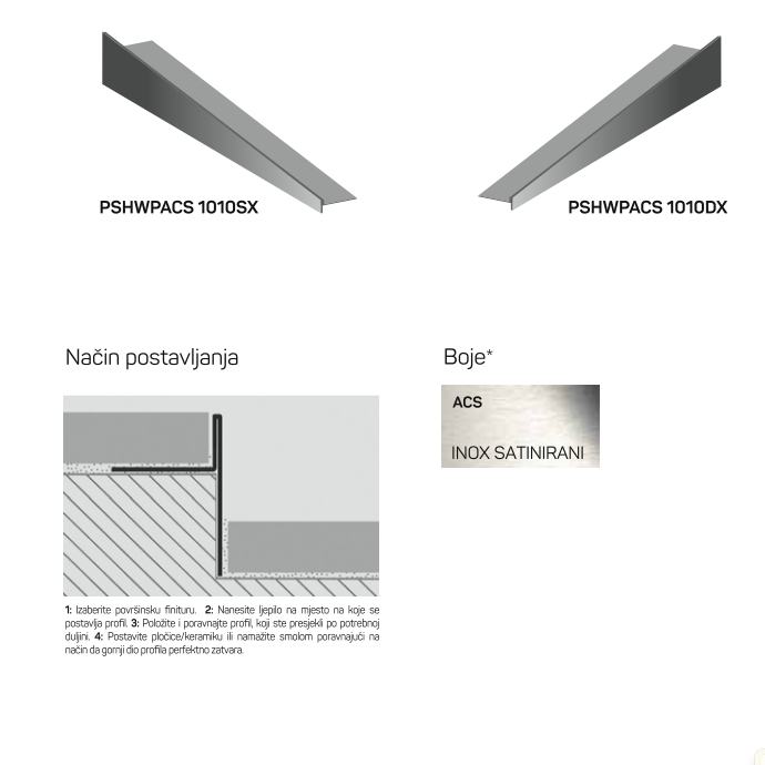 PROSHOWER PROFILE je profil izrađen od AISI 304 / 1.4301 - V2A satiniranog inoxa koji je odmašćen i pasiviziran s prilagodljivom dužinom, dizajniran za zaštitu bridova pločica i spoj ravne plohe pločica s kosim dijelom plohe pločica.