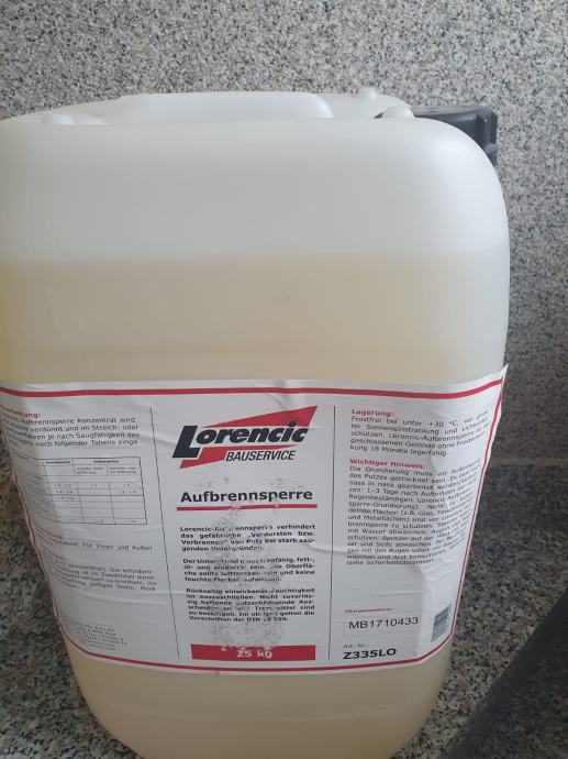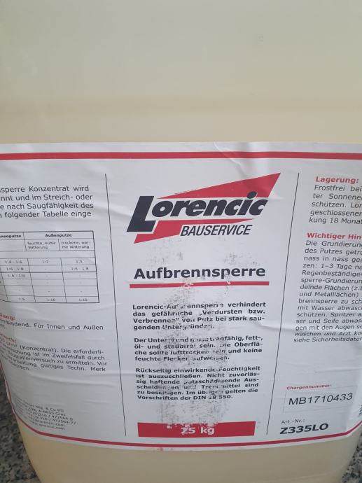 Prodajem usporivač sušenja marke Lorenčić. Sprječava brzo isušivanje žbuke kod jako upijajućih podloga. Jedan kanister ima 25 kg.