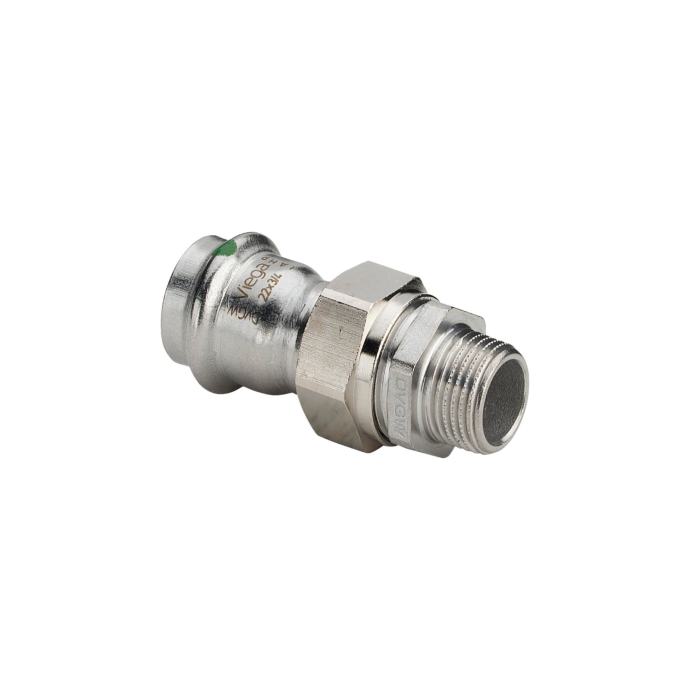 Sanpress Inox-Prijelazna navojna spojnica sa SC-Contur - nehrđajući čelik - press priključak, R-navoj - s plosnatim brtvljenjem Brtveni element EPDM, plosnata brtva EPDM, pričvrsna navojna spojnica, višestrana izvedba Podaci o materijalu odnose se na komponente koje su u doticaju s vodom! Pričvrsna matica je od poniklanog mesinga! Model 2365