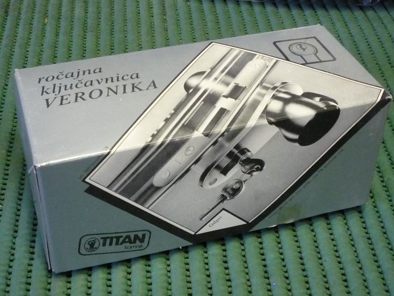 Brava Veronika ( TITAN ), kompletne kugle i štitovi od inoxa + brava od čelika na cilindrični uložak po želji. Pritiskom na crni gumb otvarate vrata, cilindričnim ključem zaključavate vrata. Cilindar nije u kompletu! Brava je nova.