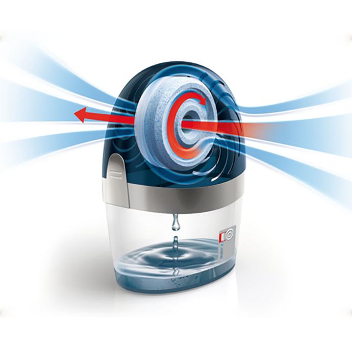 - U odstranjivač ide jedna tableta AERO 360° koja može trajati i do 3 mjeseca u prostoriji veličine 20 m2. Tableta AERO 360° pretvara vlagu u slanu otopinu. Slana otopina sakuplja se u donjem spremniku.