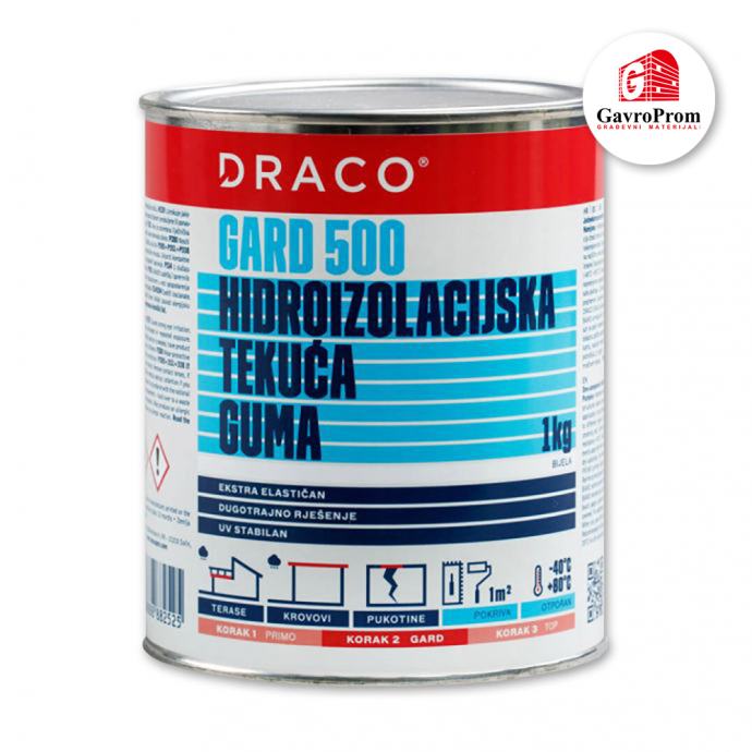 DRACO GARD 500 je jednokomponentni tekući poliuretan koji se umrežava u dodiru s vlagom iz zraka. Stvara visoko elastičnu membranu s izvrsnim prianjanjem na različite podloge. Sadrži mali postotak otapala i može se njime dodatno razrijediti korištenjem DRACO PRIMO 590. Nanosi se četkom, valjkom ili airless tehnikom u dva sloja s minimalnom ukupnom potrošnjom od 1,20 kg/m2. Proizvod se temelji na čistoj elastomernoj hidrofobičnoj poliuretanskoj smoli s dodanim specijalnim anorganskim punilima koji materijalu daju izvrsnu vremensku, UV, kemijsku, mehaničku i termalnu otpornost. Dodatkom aditiva FR-KIT, proizvod ima klasu otpornosti na požar B2 (DIN 4102). Za izložene aplikacije se preporučuje u bijeloj ili svjetlo sivoj boji.