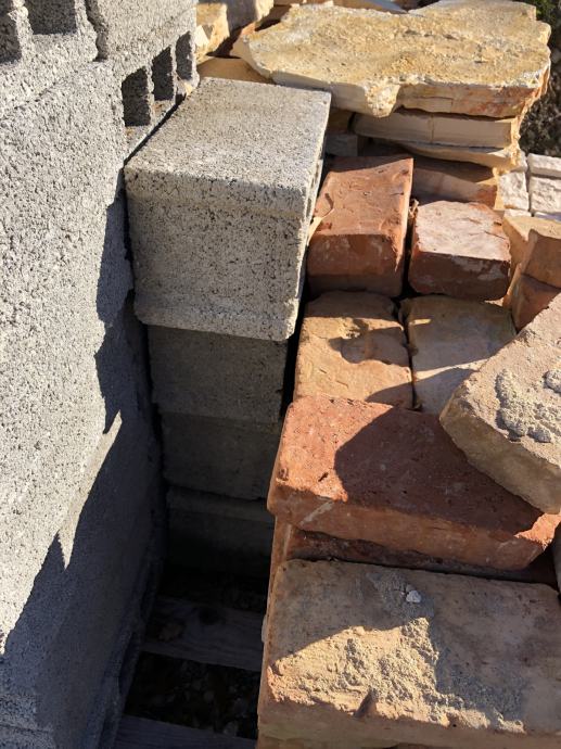 Prodajem gradjevinski materijal razni u pola cjene,bloketi x 70 kom., stara cigla puna talijanska x 80 kom.,crijep, kamen kanfanar 6,5m2, benkovačke ploče debele više od palete i po za popločavanje i još kamena za oblaganje zidova rustikalnog x 14m2. Pogledaj slike.Materijal se nalazi u okolici Zadra. Cijena za sve je 500e .