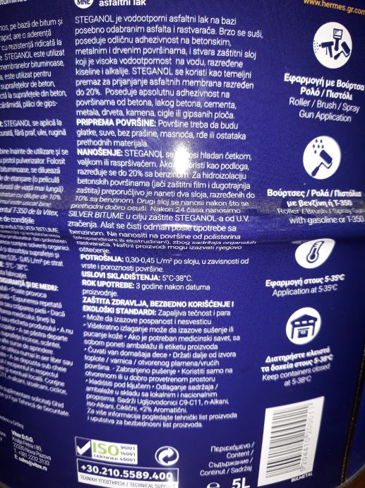 Grčka hidroizolacija Steganol nanosi se četkom rastvorena benzinom,korištenje u brodogradnji,zaštiti čamaca,temelja,bazena i svega dije potrebna zaštita od vode i vlage 0976687400