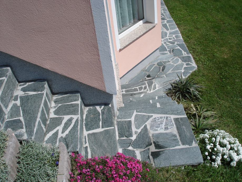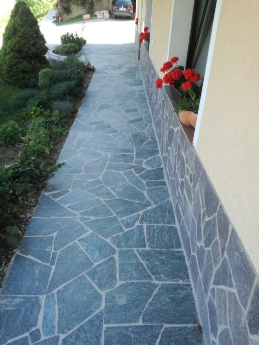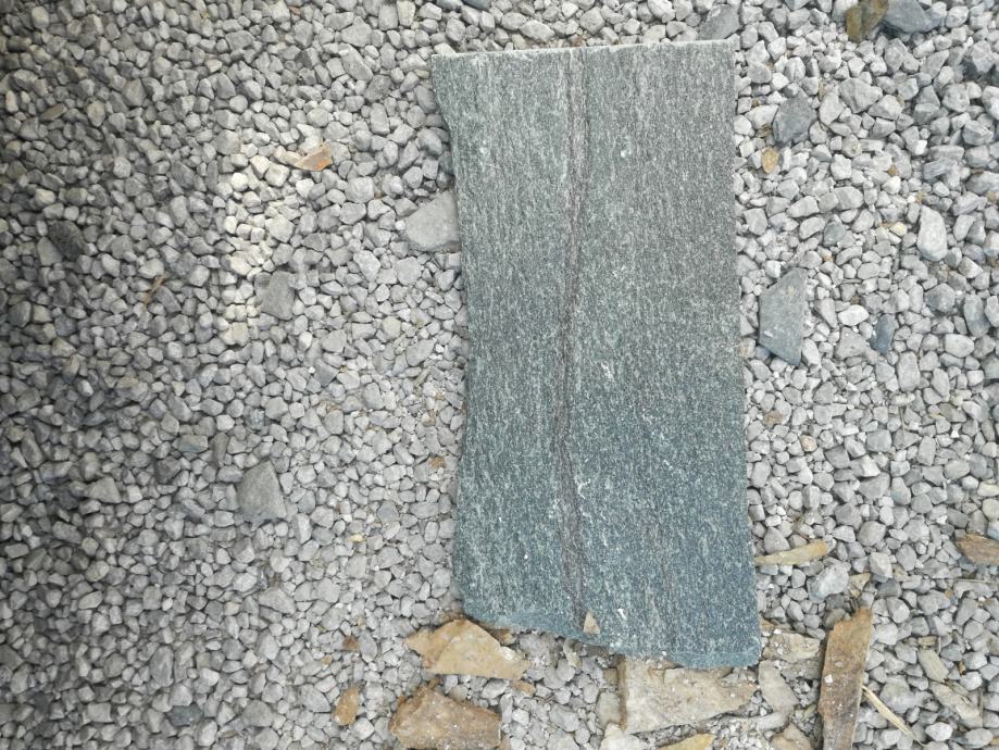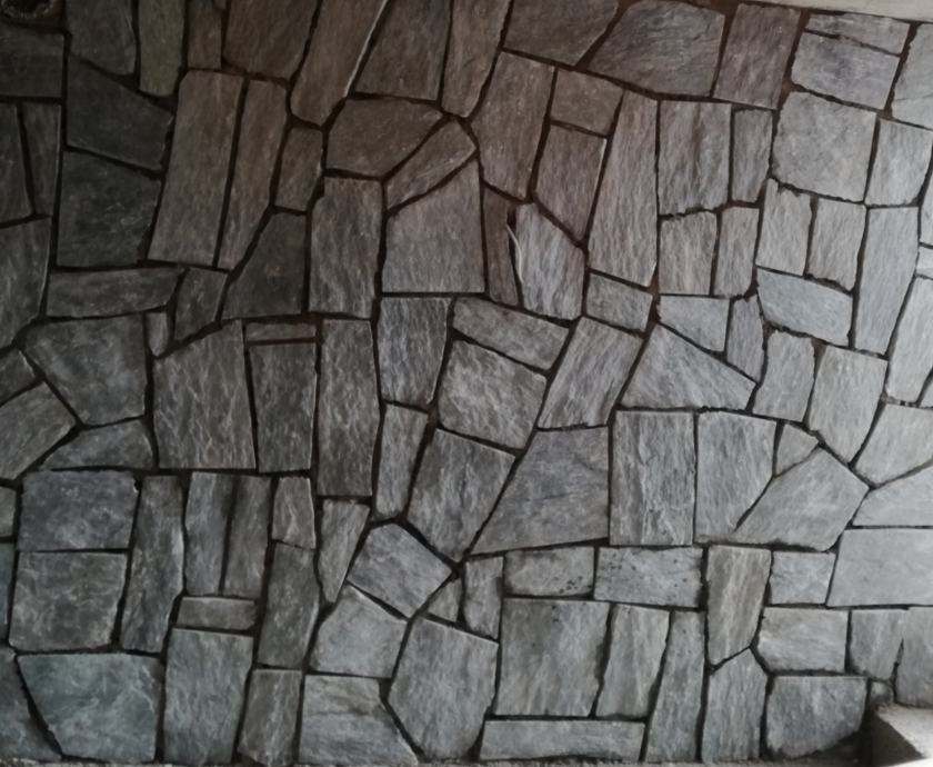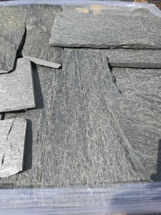 Naravni kamen Serpertino zelenkaste barve, odporen proti zmrzali in drugim vremenskim razmeram.