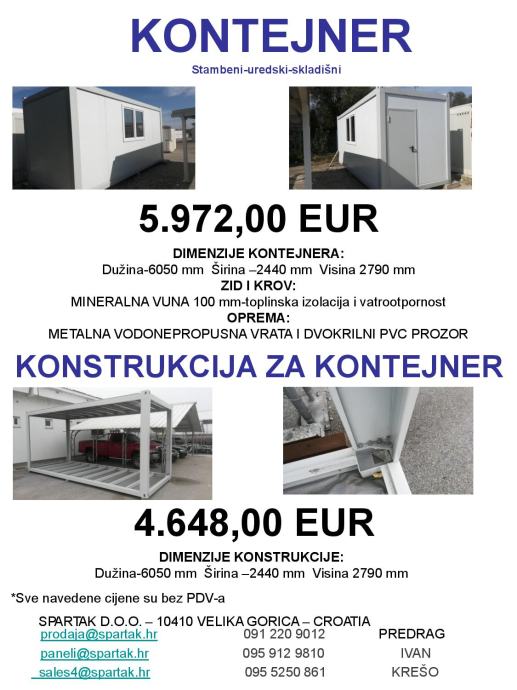CIJENA: 5.972,00 EUR + PDV - NAPOMENA: KONTEJNERI DOLAZE U DIJELOVIMA I OVA CIJENA ODNOSI SE NA KONTEJNER U DIJELOVIMA, OPCIJA MONTAŽE KONTEJNERA JE 550 EURA + PDV