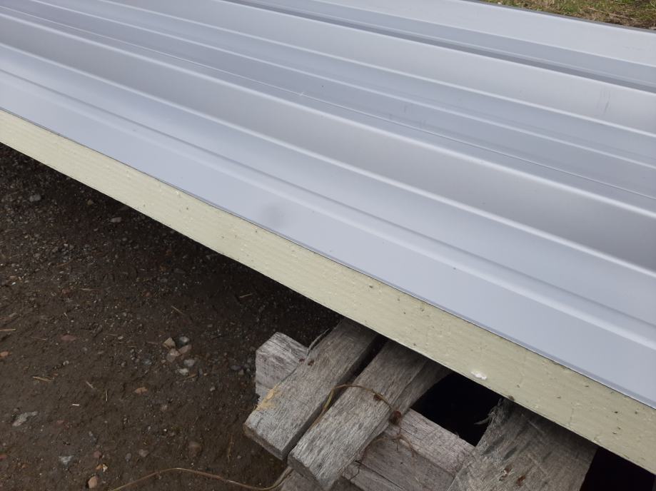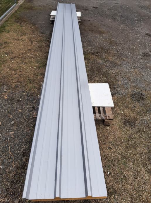 Krovni sendvič panel novi, dužina 675 cm, širina 63 cm, debljina 5 cm, odrezana zadnja ploča. Ima ukupno 4 kvadrata. Gornja boja srebrna, donja bijela. Plaćen je 30 eura po m2. Prodajem cijelu ploču za 65 eura. Mob 091 444 4281