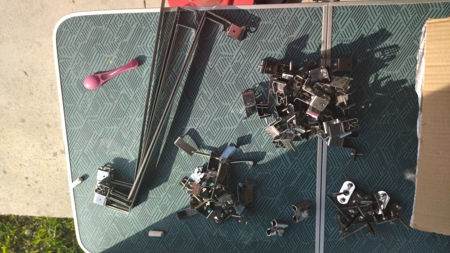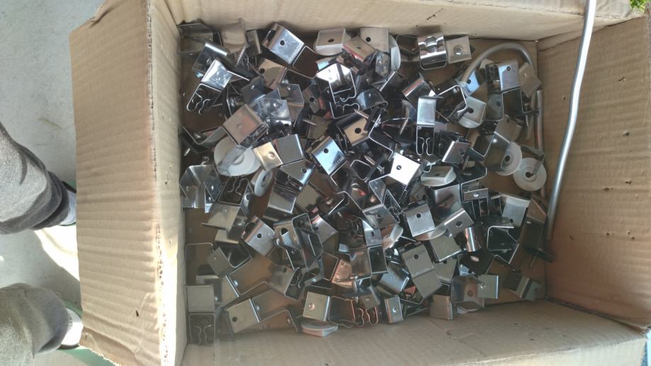 Cca 10 nosača za traku za zid, 10 sljemenjaka za žicu, 30 nosača za aluminijski krov, 10 nosača za crijep..2 brze spojnice za žicu